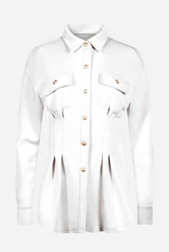 Blouse Sienna in de kleur Off white heeft een perfecte combinatie van stijl en comfort. De blouse is gemaakt van een heerlijke zachte kwaliteit met stretch, waardoor een comfortabele pasvorm gegarandeerd is. De blouse heeft lange mouwen, een klasssieke kraag, charmante klepzakjes op de borst, gouden drukknoopsluitingen aan de voorkant en een getailleerde pasvorm met plooit details. Draag blouse Sienna met onze broek Poppy voor een prachtig en stijlvolle co-ord look